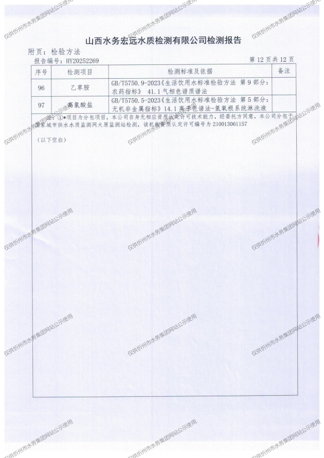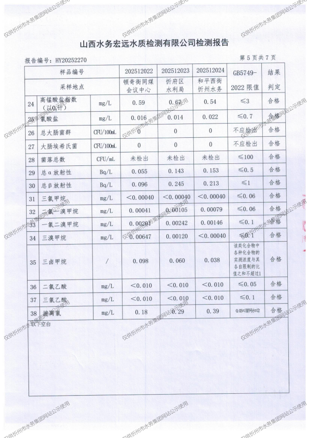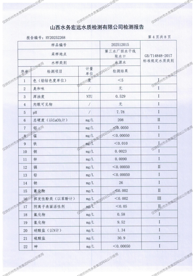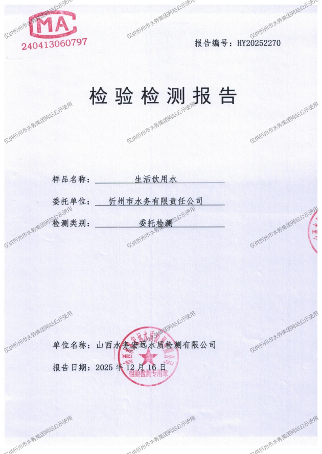 忻州城區(qū)公共供水水源水、出廠水、管網(wǎng)水、管網(wǎng)末梢水2025年12月份水質(zhì)信息公示