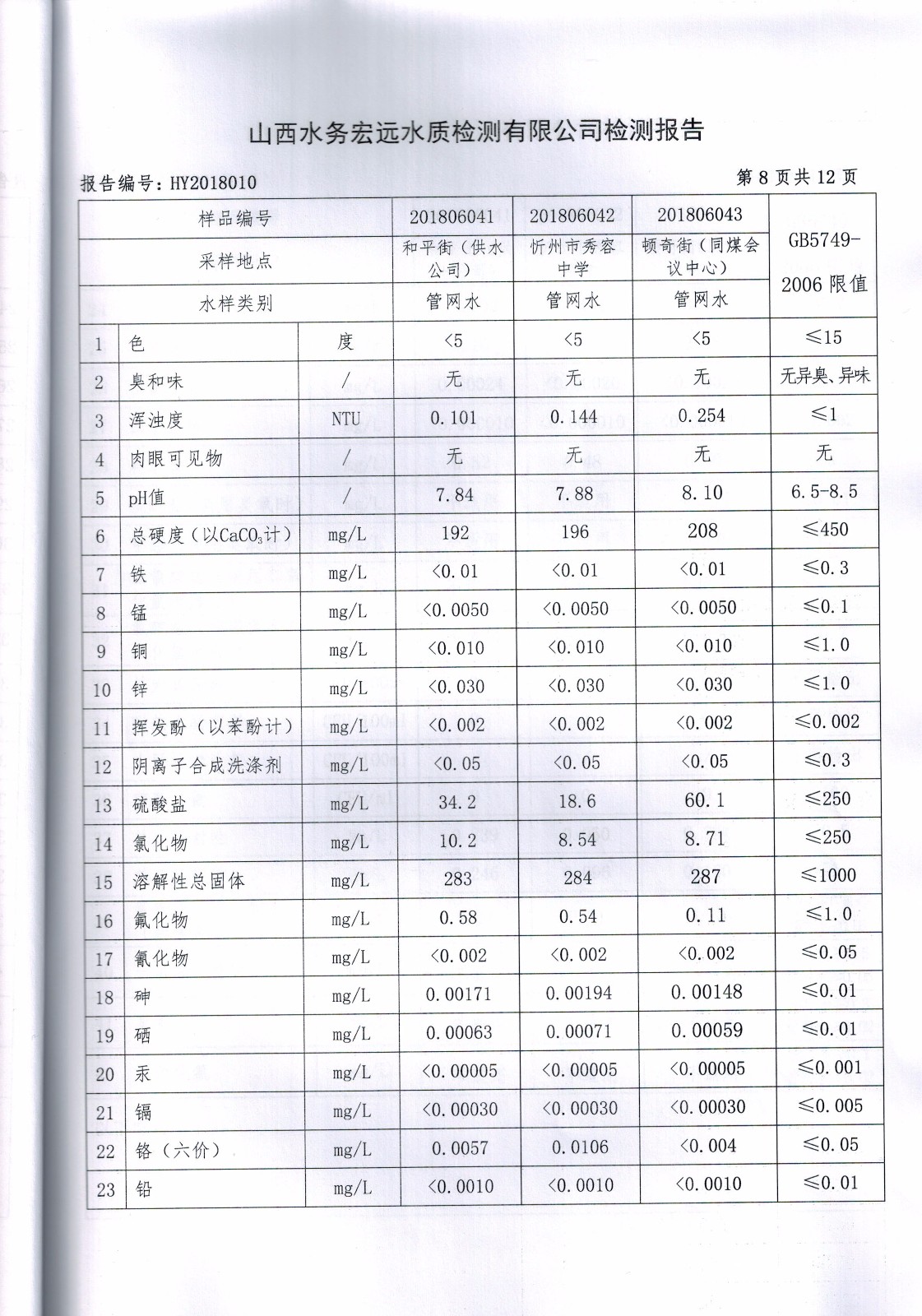 忻州城區(qū)公共供水水源水、出廠水、管網(wǎng)水、管網(wǎng)末梢水2018年6月份水質(zhì)信息公示
