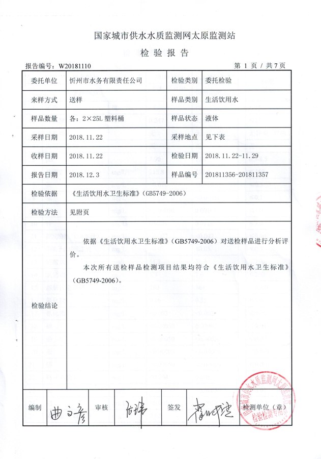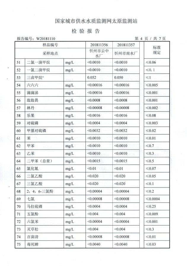 2018年忻州城區(qū)公共供水南水廠、云中水廠出廠水106項水質(zhì)全分析信息公示